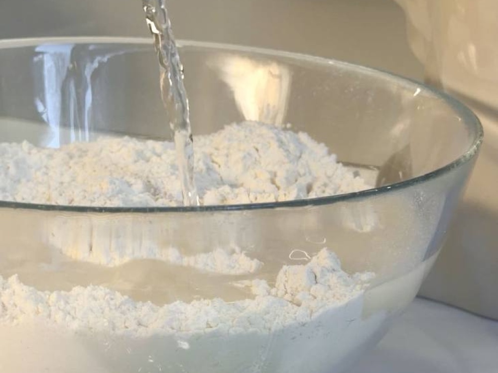 Далее водно-сахарную жидкость добавим к просеянной пшеничной муке с дрожжами.