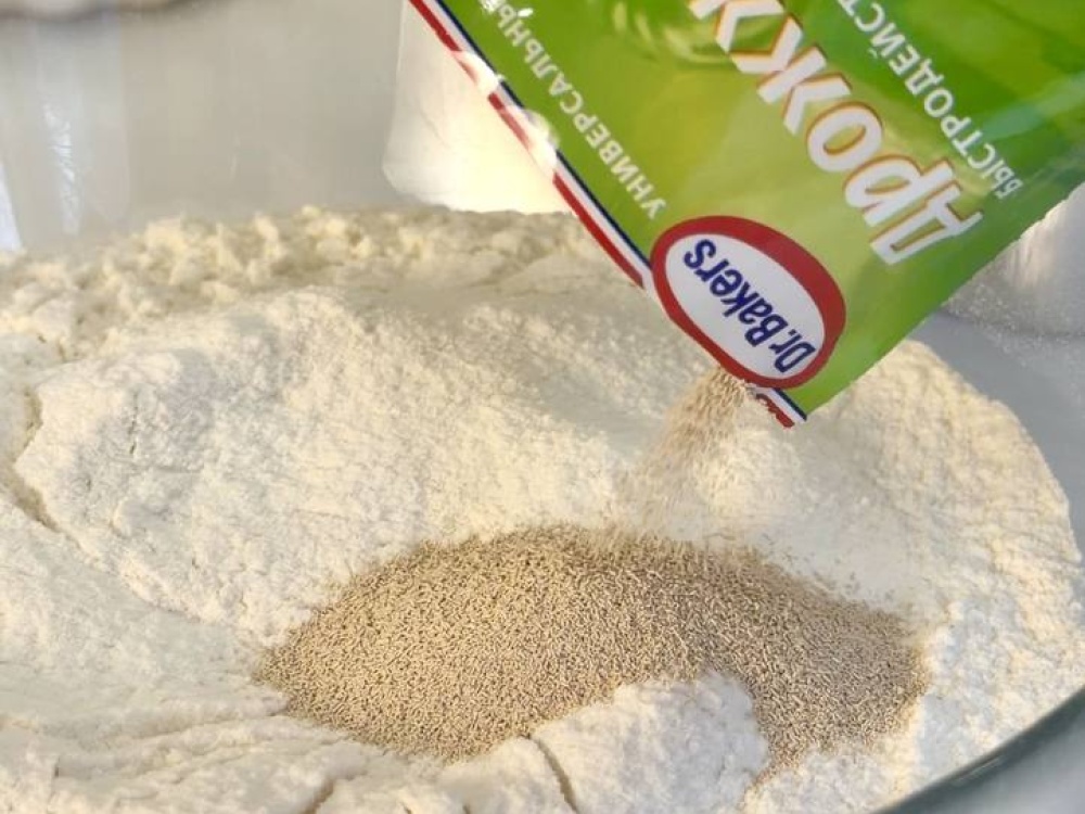 Сухие дрожжи смешиваем с мукой для равномерного распределения.