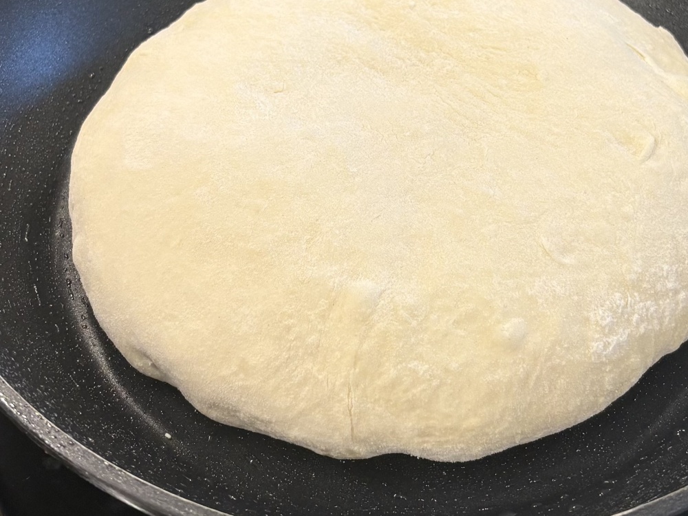 Хорошенько замешиваем тесто. Кладем его в толстостенную сковороду, смазанную маслом, накрываем крышкой и оставляем для расстойки на 40 минут.