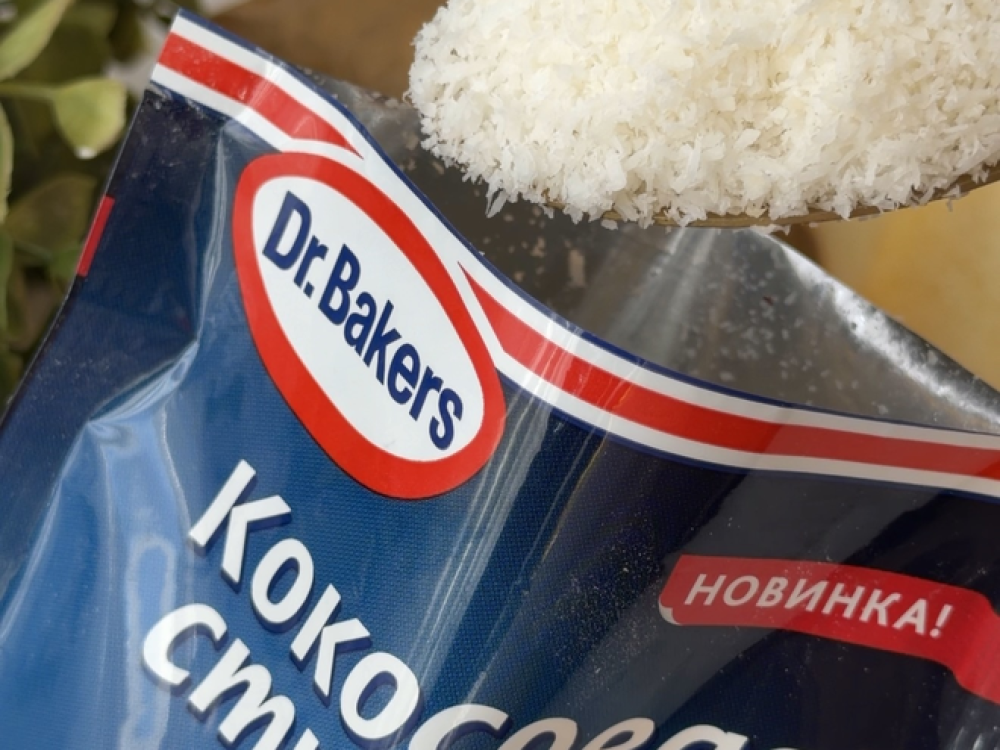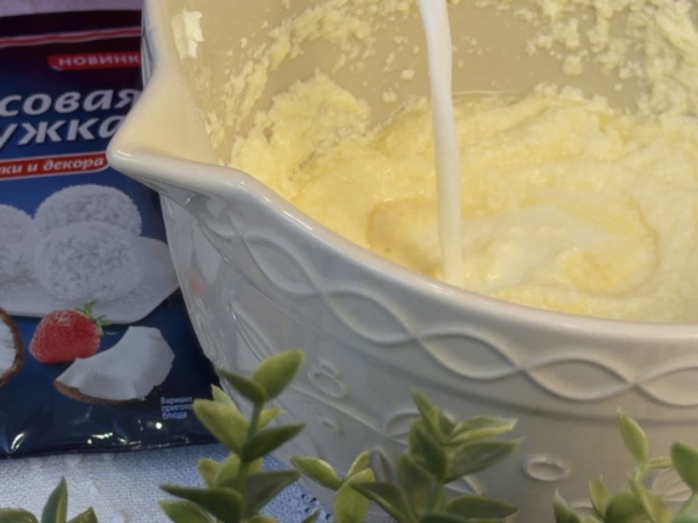 Вливаем кокосовое молоко (130 мл), всыпаем муку (240 г), добавляем кукурузный крахмал (30 г) и разрыхлитель Dr. Bakers (1 уп.). Перемешиваем венчиком до однородности.