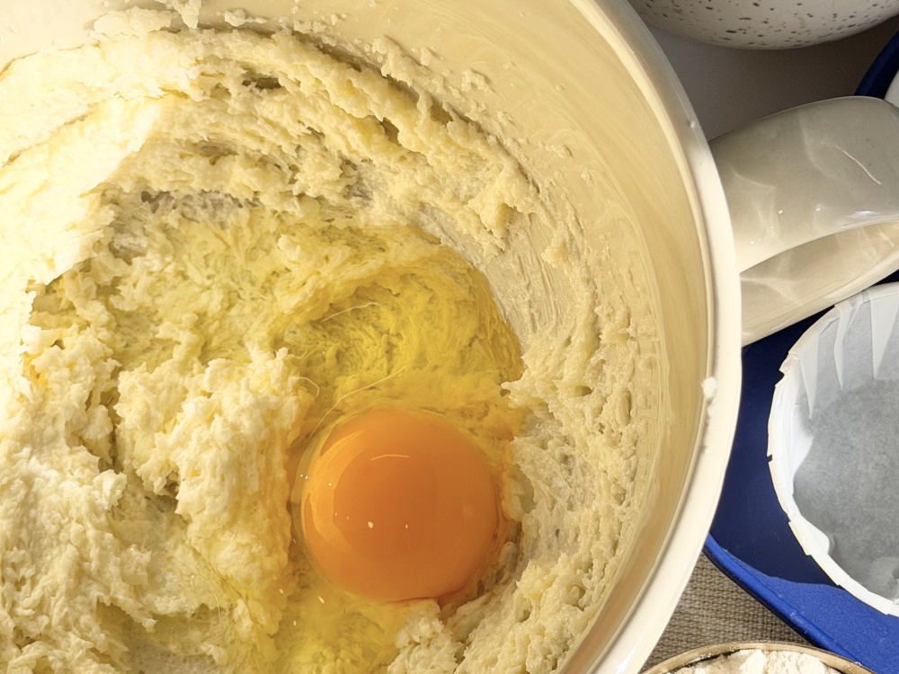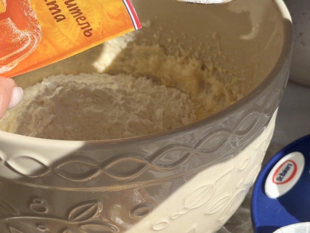 Добавить ванильный сахар, соль, ванилин-интенсив, хорошо взбивая. Муку просеять с разрыхлителем.