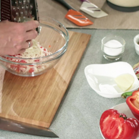 Помидоры порезать на кусочки, предварительно удалив сердцевину с семенами. Сладкий перец и ветчину порезать кубиками. Сыр Моцарелла натереть на крупной терке.