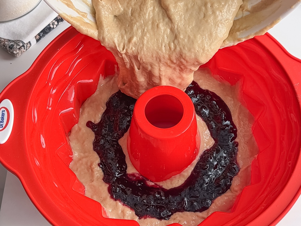 Выливаем половину теста в форму и разравниваем. В центр ровным слоем добавляем густое варенье (250 г). Поверх варенья аккуратно распределяем оставшуюся часть теста. Выпекаем при 165°C 45-55 минут, до сухой шпажки.