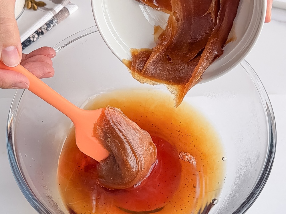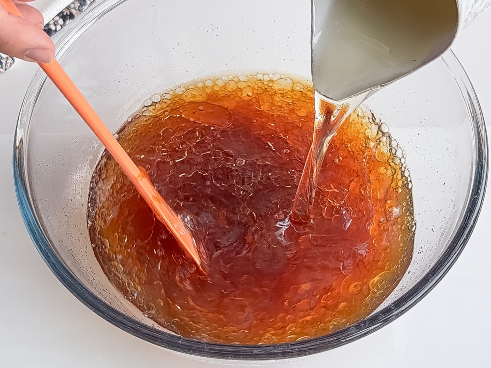 В глубокой миске соединяем воду (300 мл), тёплый чай (100 мл), мёд (140 г) и ванильный сахар с натуральной ванилью Dr. Bakers (15 г). Перемешиваем до полного растворения мёда.
