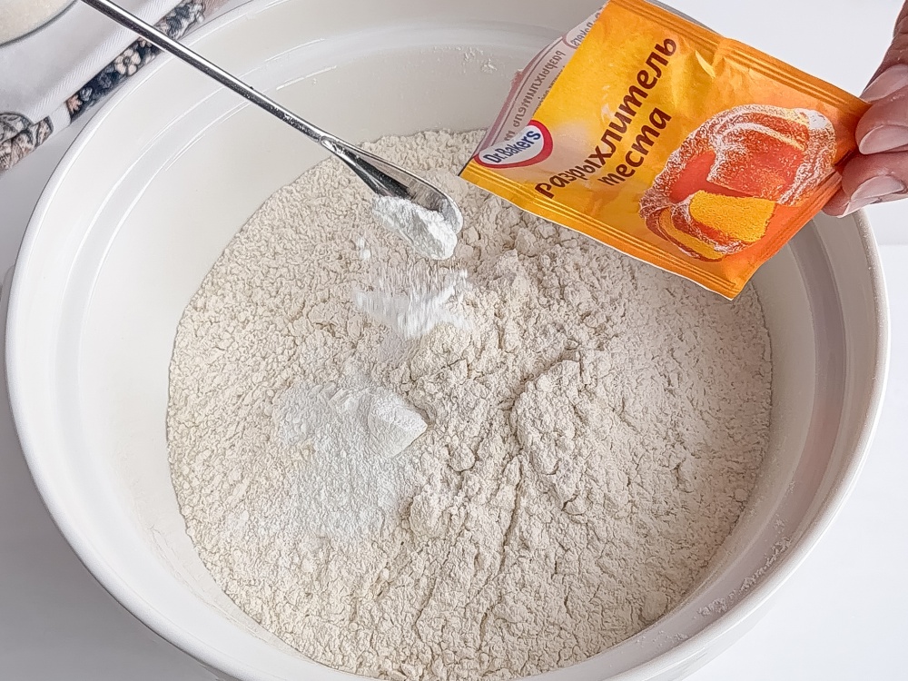 Муку (400 г) просеиваем с разрыхлителем Dr. Bakers (10 г).