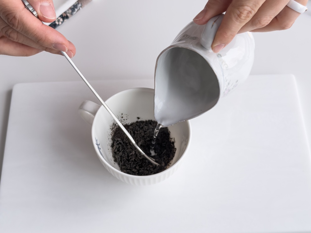 Чёрный чай (15 г) заливаем кипятком (100°C, 100 мл), накрываем и даём настояться 10 минут. Затем процеживаем.