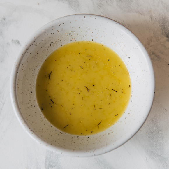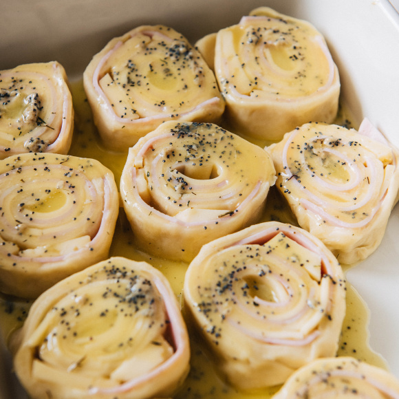 Мелко нарезанное сливочное масло растапливаем в сотейнике на плите. Затем добавляем в масло мак, горчицу и смесь трав (по желанию можно использовать свежую зелень). Перемешиваем венчиком для равномерного распределения ингредиентов. При помощи кулинарной кисти покрываем каждый рулетик данной смесью, при этом стараемся покрыть не только верхнюю часть, но и бока.