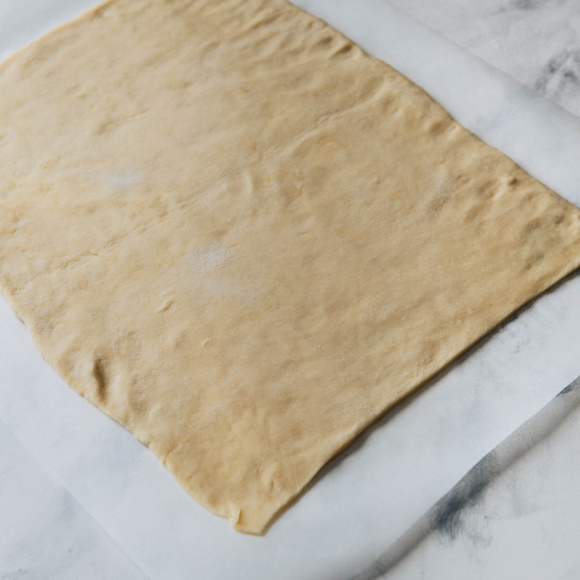 Спустя указанное время достаём тесто из холодильника, посыпаем рабочую поверхность тонким слоем муки и раскатываем тесто в ровный прямоугольный пласт. После этого сворачиваем пласт в рулет, заворачиваем в плёнку и снова отправляем в холодильник на 1 час.