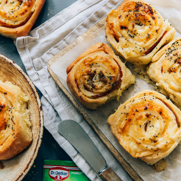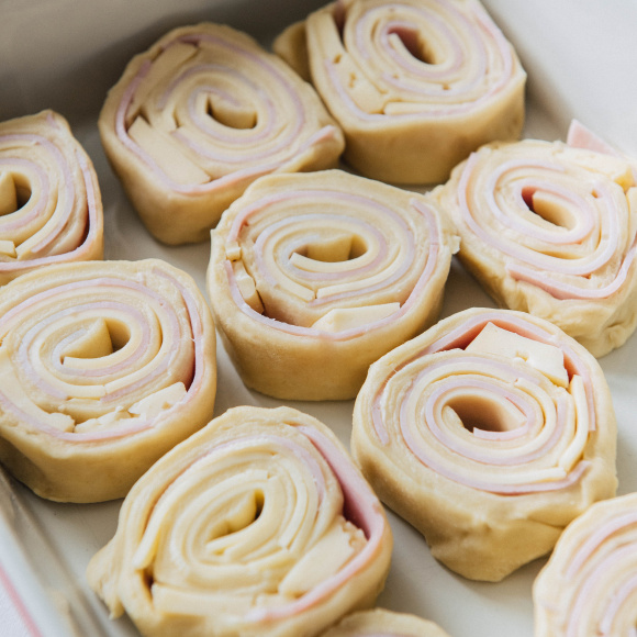 Если необходимо отложить приготовление, то готовое тесто можно ещё раз скрутить в рулет, уже в обратную сторону, и выдерживать в холодильнике в течение ночи. Ну а мы сразу приступим к формированию рулетов с сыром и ветчиной.