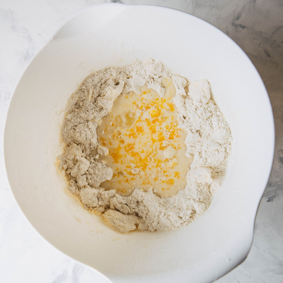 Получившуюся крошку всыпаем в молочно-яичную смесь и переходим к процессу замешивания теста. Нет необходимости вымешивать тесто слишком долго, достаточно объединить все компоненты в однородную массу.