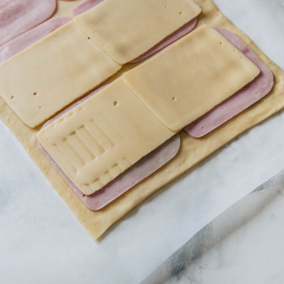 Натираем сыр на мелкой тёрке (предпочтение отдавайте сыру с жирностью не менее 50%, так как он лучше поддаётся измельчению, а используя несколько разных сортов сыра, вы получите новый, более богатый вкус). Ветчину натираем на крупной тёрке либо мелко нарезаем кусочками произвольной формы. Достаём тесто из холодильника, разворачиваем и обильно, но равномерно, посыпаем начинкой (сыр+ветчина), после чего сворачиваем в плотный рулет.