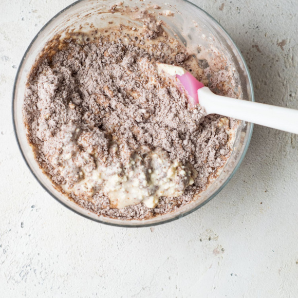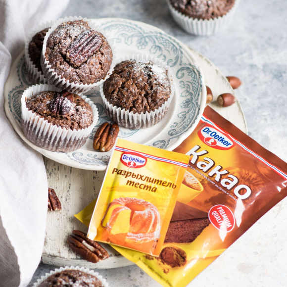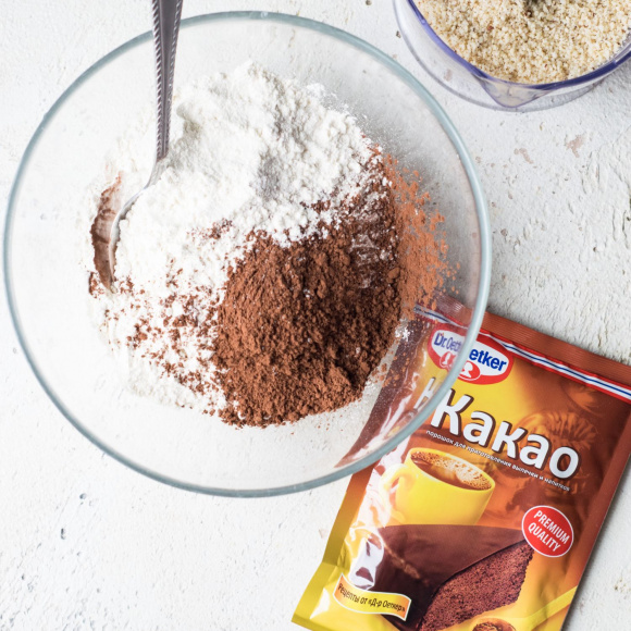 Просеиваем 200 г пшеничной муки через сито. Перемешиваем просеянную муку со 100 г коричневого сахара, 3 ст. л. какао Dr. Bakers, перемолотыми орехами и 1 ч.л. разрыхлителя Dr. Bakers.