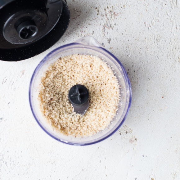 Фундук очистить от скорлупы и перебрать. Перемалываем 75 г фундука в блендере до состояния мелкой крошки.