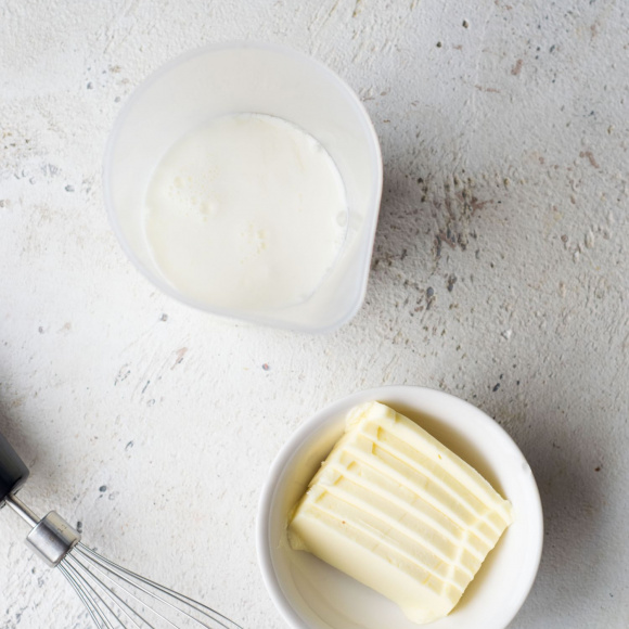 Соединяем 200 г кефира, 70 г молока и 1 яйцо. Добавим размягченное, чуть взбитое сливочное масло в количестве 85 г, взбиваем все вместе еще раз блендером с насадкой-венчиком.