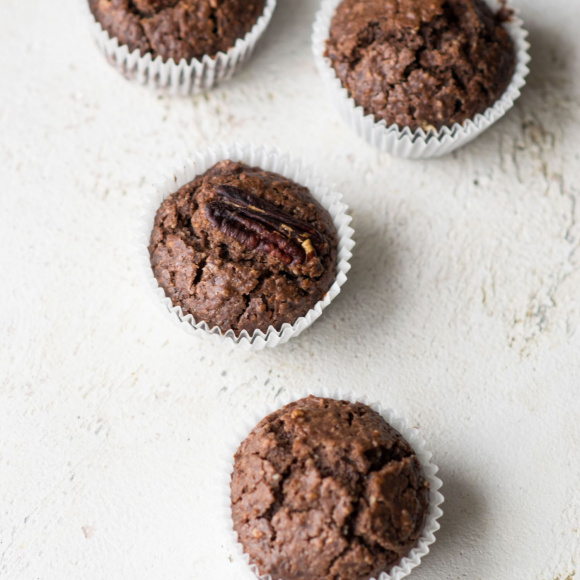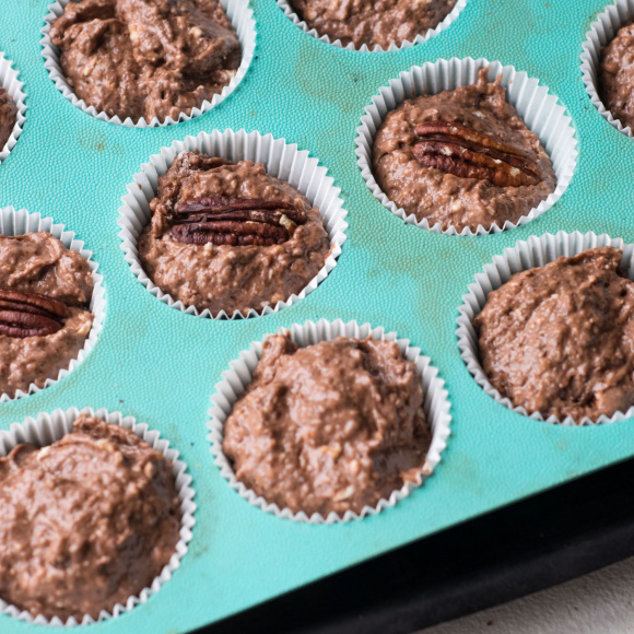 Раскладываем тесто по бумажным капсулам или формочкам для маффинов. В каждый маффин вкладываем по ореху пекан. Чтобы готовые маффины не прилипли к формочкам, внутрь можно положить полоски пергаментной бумаги - так вам потом будет удобнее их доставать.