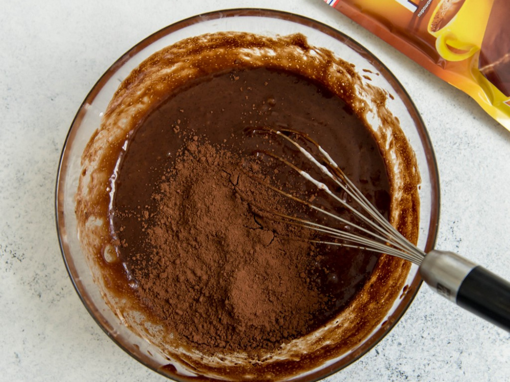 Введите в шоколадную смесь какао. Его лучше просеять, чтобы разбить мелкие комочки. Снова перемешайте.