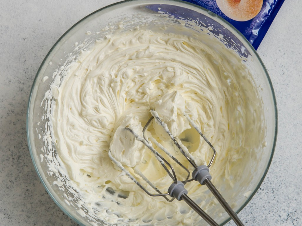 Пока шоколадные капкейки пекутся, приготовим сливочный крем. В миску положите сыр и сахарную пудру, налейте холодные сливки (до этого момента их лучше держать в холодильнике). Взбиваем все миксером. Сначала на низкой скорости, чтобы пудра не разлетелась, затем увеличим до максимума. Взбивать долго не нужно. Крем быстро загустеет. Он должен хорошо держаться на перевернутой ложке.