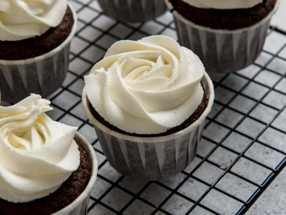 Переложите крем в кондитерский мешок с любимой насадкой и украсьте остывшие капкейки красивой шапочкой. Если у вас нет кондитерского мешка, то можно просто аккуратно выложить крем сверху с помощью чайной ложки. Капкейки будут выглядеть ещё более нарядно, если сверху украсить их кондитерской посыпкой.