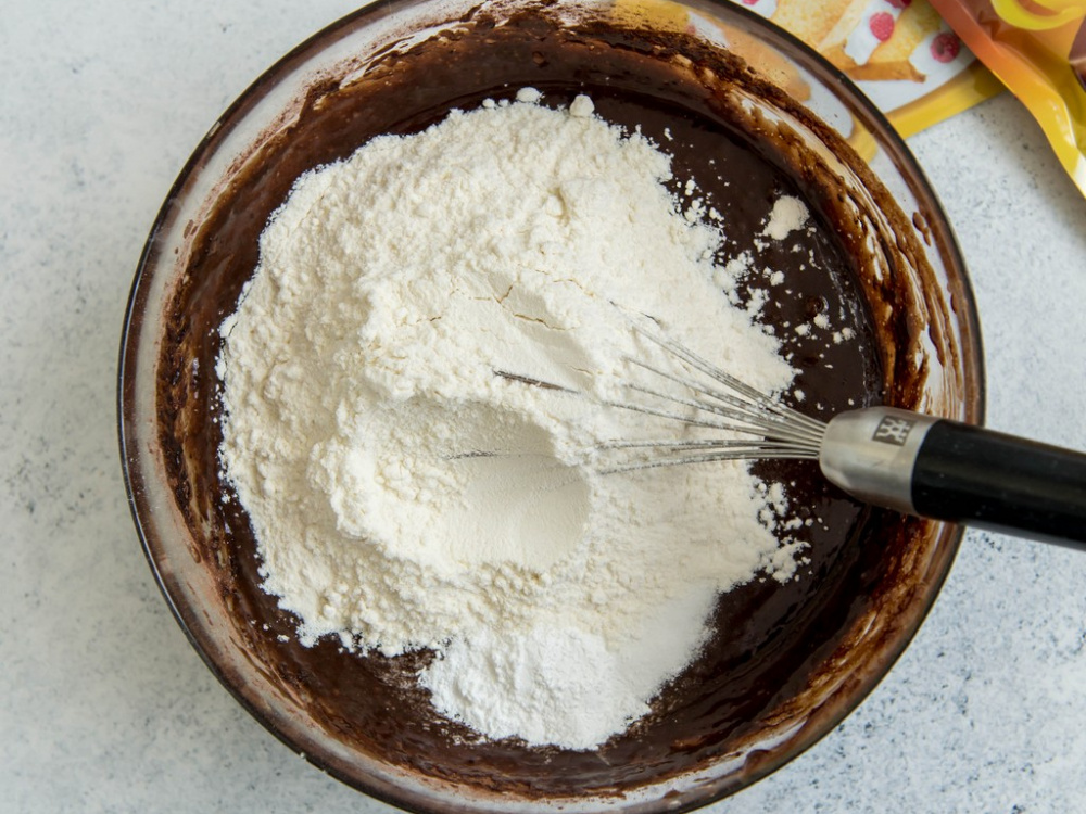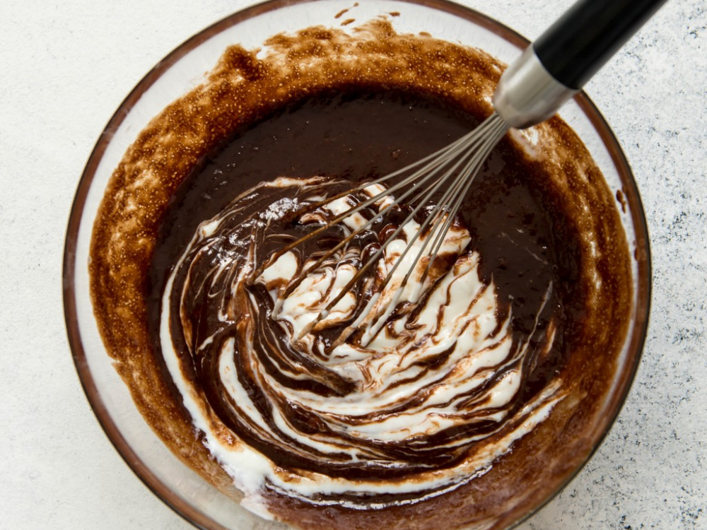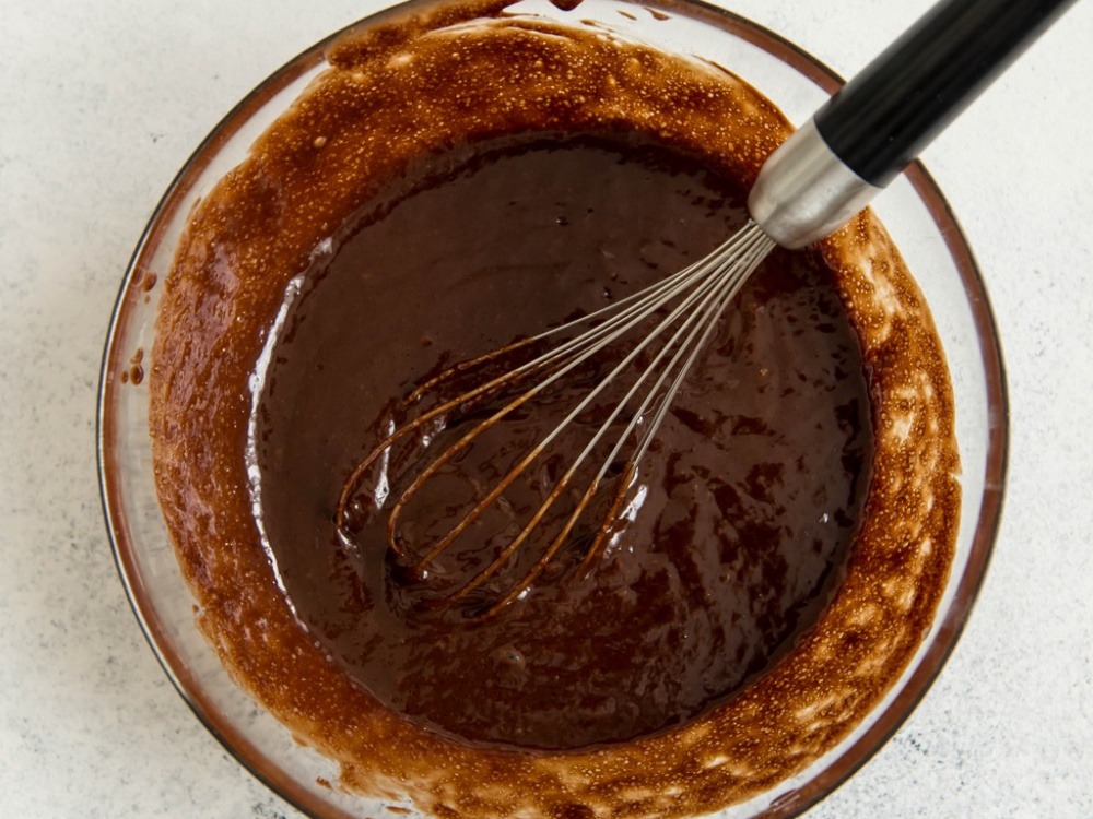 Дайте смеси немного остыть. Взболтайте яйца, введите их в шоколадную смесь и перемешайте венчиком.