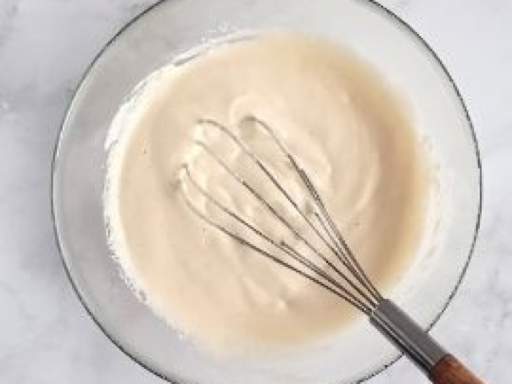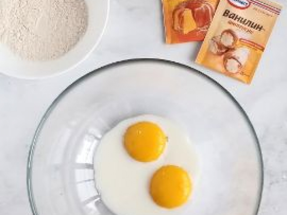 Яйца комнатной температуры разделяем на белки и желтки. Желтки перемешиваем с молоком, добавляем просеянную муку с разрыхлителем и ванилин-интенсив. Еще раз перемешиваем до объединения продуктов.