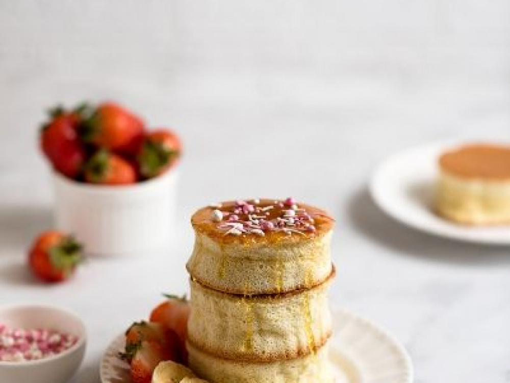 Сковороду с толстым дном хорошо прогреваем на маленьком огне. Слегка смазываем ее растительным маслом, излишки убираем салфеткой. Выкладываем тесто по 3 ст. л. на 1 панкейк, закрываем сковороду крышкой и готовим на мощности ниже средней. Когда видим, что верхняя часть «схватилась», переворачиваем панкейки с помощью широкой лопатки, снова накрываем сковороду крышкой (среднее время приготовления 4 минуты с каждой стороны). С готовых панкейков снимаем пергаментную бумагу, поливаем медом, украшаем посыпками Dr. Bakers. Подаем с ягодами.