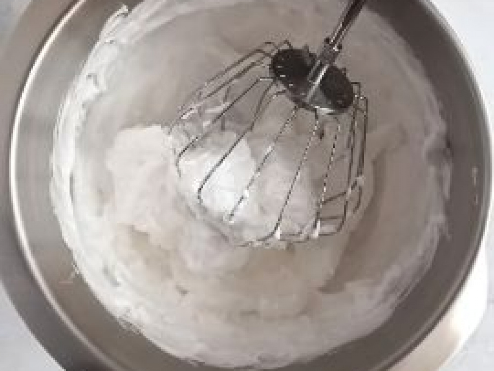 К белкам добавляем щепотку соли и взбиваем, постепенно добавляя весь сахар, до устойчивых пиков.