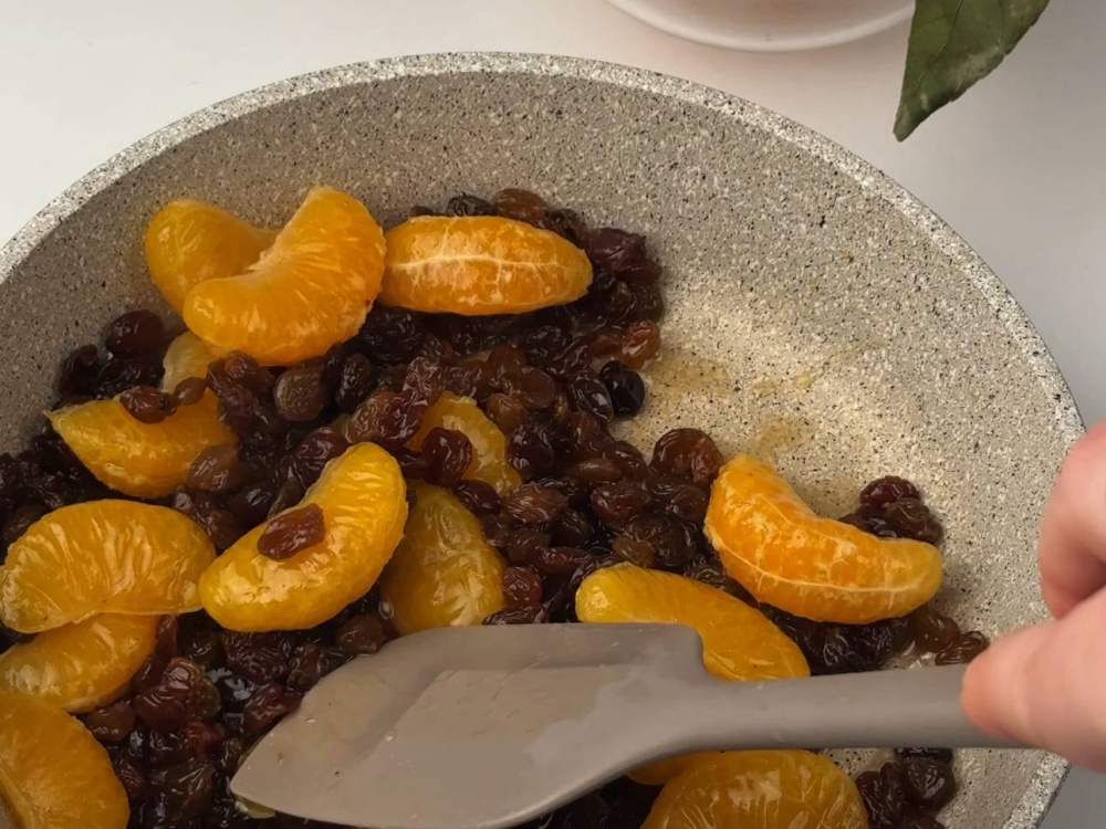 В ту же сковороду поместите замоченные сухофрукты и выдержите их, пока не испарится ликер, а затем дайте остыть.