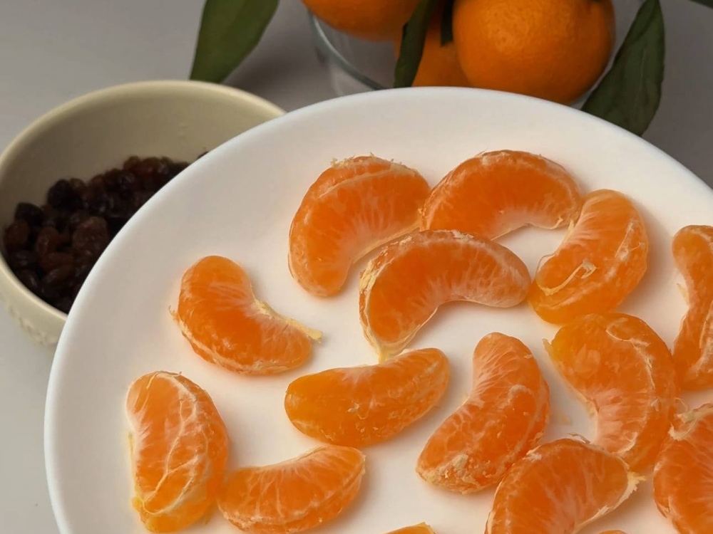 Очистите и разберите на дольки мандарины. Оставьте их на час подсохнуть. Замочите в ликере сухофрукты и достаньте из холодильника яйца и масло, чтобы они немного нагрелись.