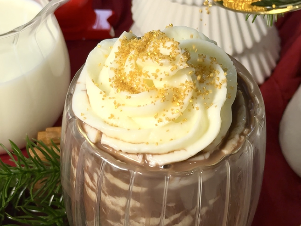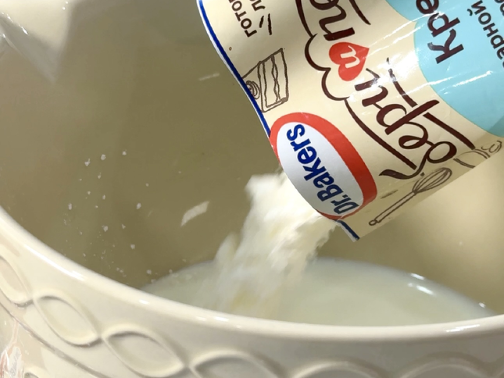 К остывшему крему добавляем творожный сыр (150 г) и взбиваем массу миксером. Выкладываем крем в кондитерский мешок и делаем шапочку на тёплом какао. Посыпаем посыпкой «Кристаллы» Dr. Bakers (1 ч. л.).