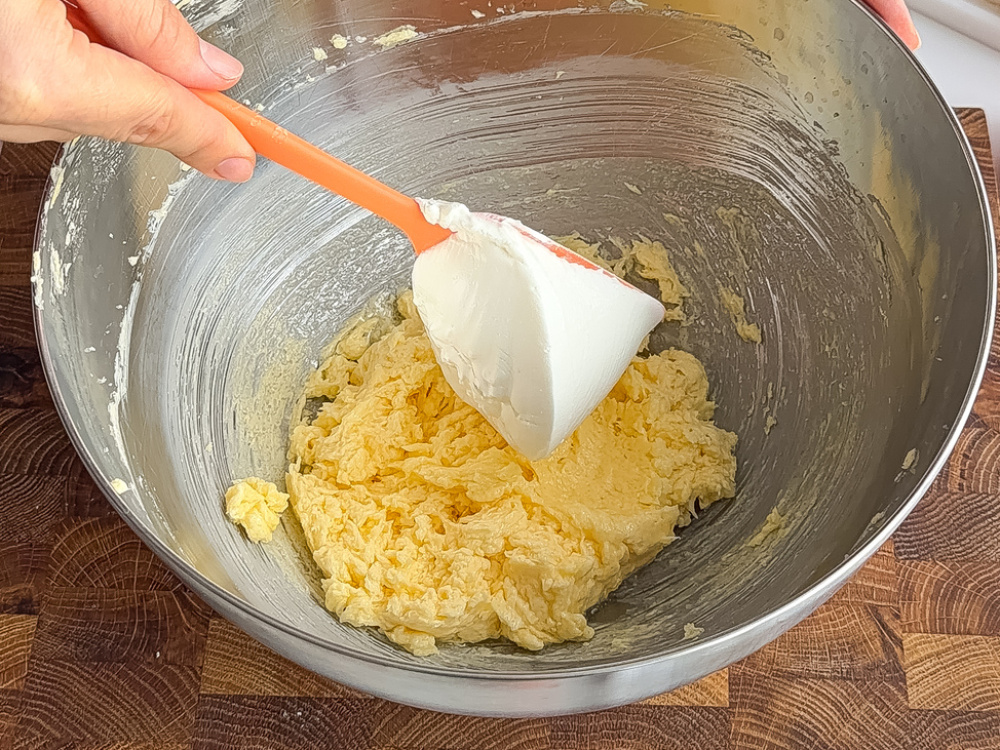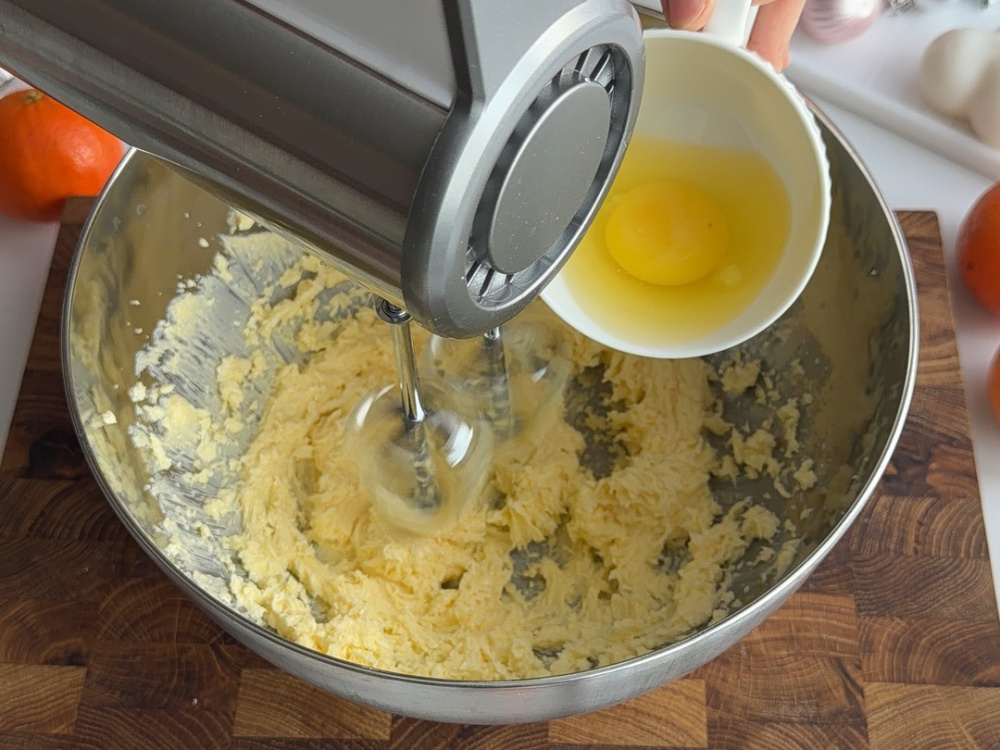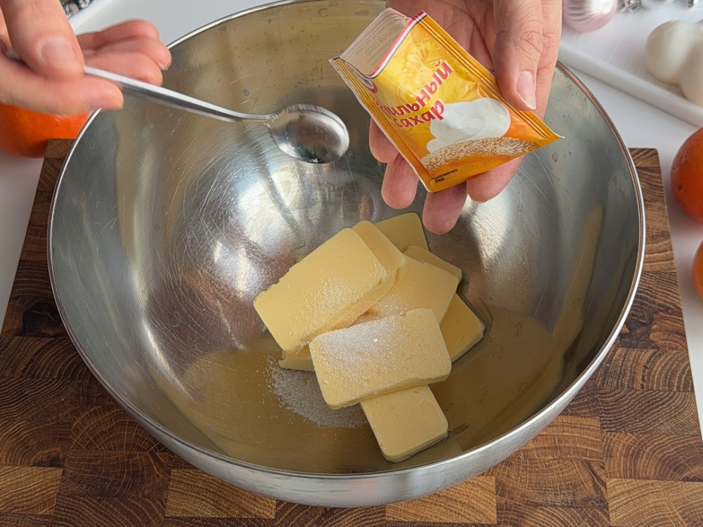 В чашу кладем сливочное масло и сахар, всё взбиваем до однородного состояния.