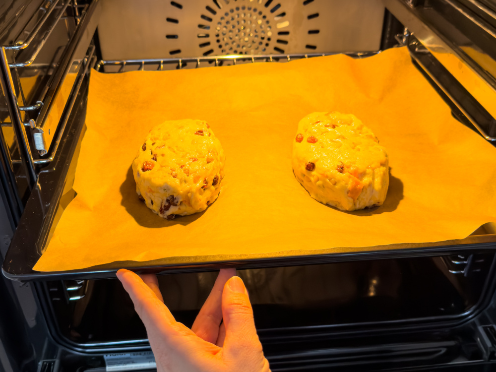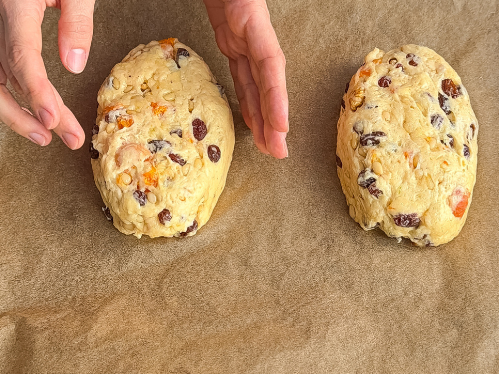 Делим тесто на 2 части (или можно испечь один большой штоллен), формируем и ставим в заранее разогретую до 180 градусов духовку.