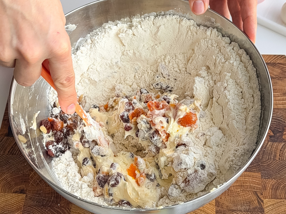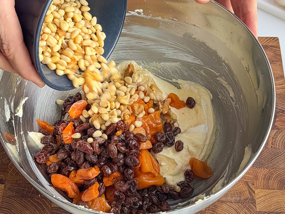 В самом конце кладем мучную смесь, орехи и цукаты.
