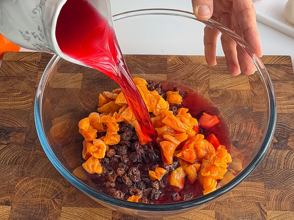 Изюм, курагу, клюкву замачиваем в роме или апельсиновом соке. Орехи обжариваем на сковороде.