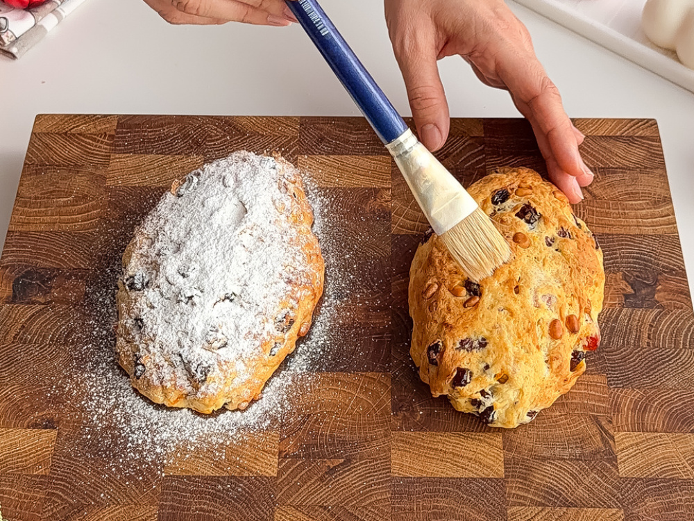 Топим сливочное масло и смазываем им теплый штоллен, сверху обильно посыпаем сахарной пудрой.