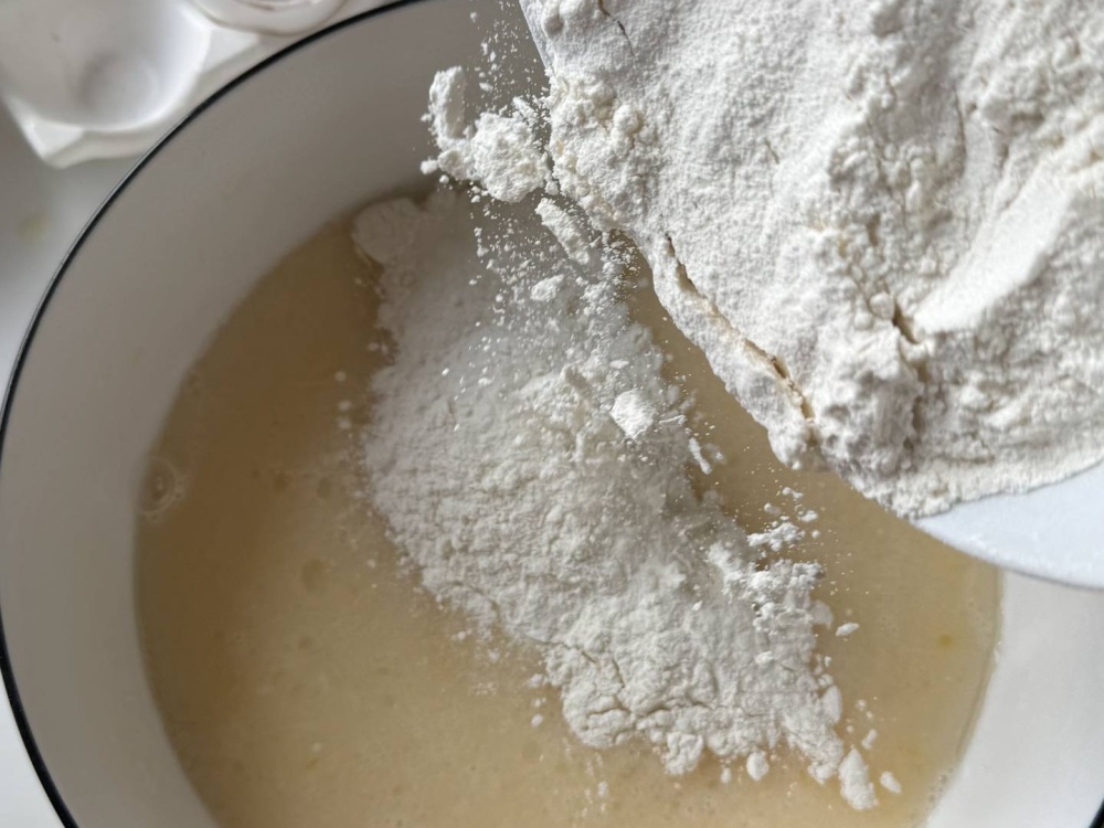Хорошо все перемешиваем и начинаем добавлять муку. Муки потребуется 3-4 стакана, на глаз. Тесто должно быть немного жидким. К муке добавим 1 пачку разрыхлителя Dr. Bakers.