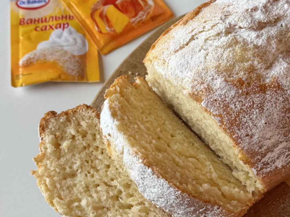 Посыпаем готовый кекс сахарной пудрой и зовем семью к чаю. Кекс получается очень высокий и вкусный.