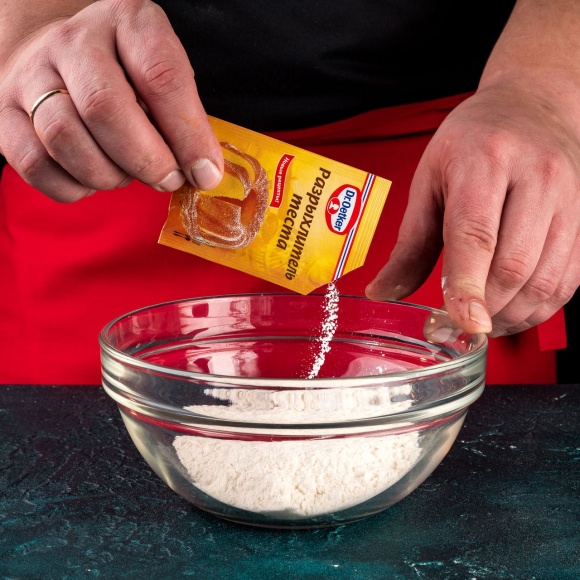В отдельную миску просейте муку, добавьте разрыхлитель Dr. Oetker и соль, перемешайте сухую смесь венчиком в течении 30 секунд.