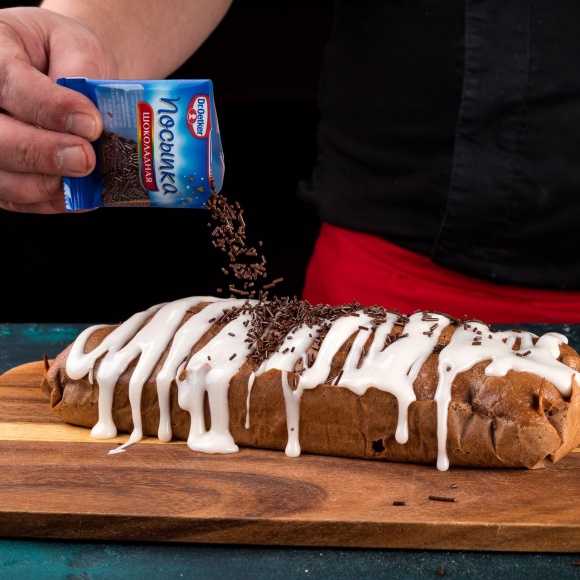 Полейте ею сверху коврижку и украсьте шоколадной посыпкой «Палочки» Dr. Oetker.