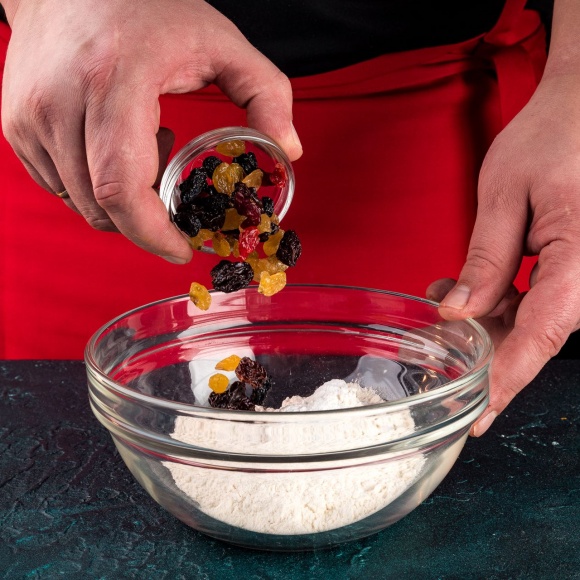 Промытый изюм добавьте в мучную смесь и перемешайте.