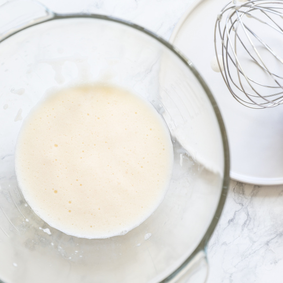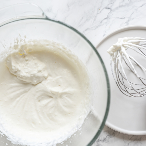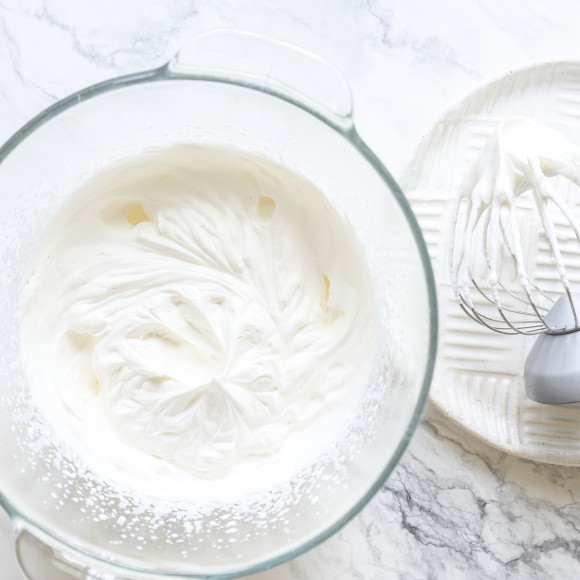 Жирные сливки, миску, в которой будем их взбивать, и венчики миксера кладем на 10 минут в морозилку. Чтобы сливки хорошо взбивались и не расслоились, приступать к взбиванию нужно сразу, как только достали с холода. Взбиваем сливки миксером на высоких оборотах до устойчивых пиков. Убираем в холодильник.