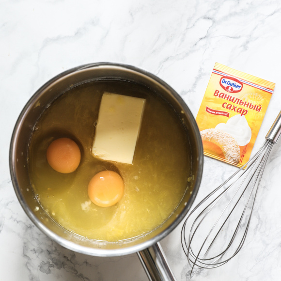 Для приготовления шоколадного гляссажа (зеркальная глазурь) варим инвертный сироп. В кастрюлю наливаем воду, засыпаем сахарный сироп и нагреваем до закипания.