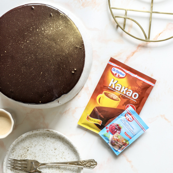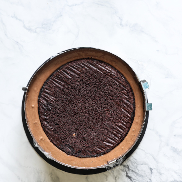 Достаем из морозильной камеры кольцо с апельсиновым муссом. Лопаточкой выкладываем на него шоколадный мусс, разравниваем.