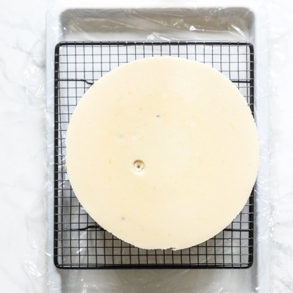 Замороженный торт достаем из морозильной камеры. Чтобы достать торт из формы, можно несколько минут прогреть стенки формы руками или обернуть горячим, влажным полотенцем. Переворачиваем торт так, чтобы бисквит оказался внизу. Перекладываем на решетку.