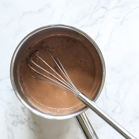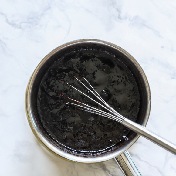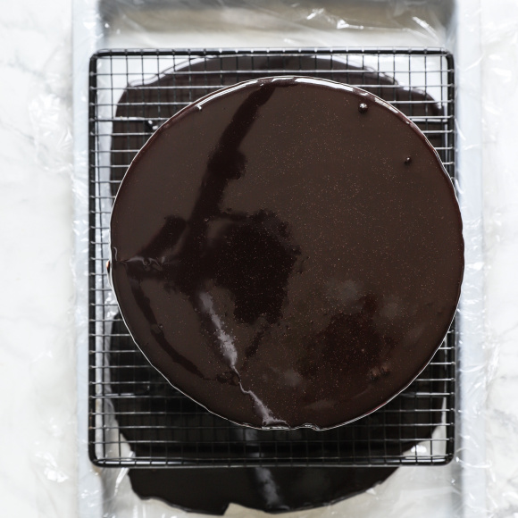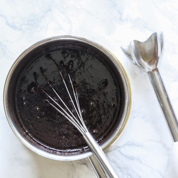 В миску с высокими бортами переливаем шоколадный сироп и сливки. Пробиваем погружным блендером, пока гляссаж не станет гладким, блестящим и однородным. Если пузырьков слишком много, также процеживаем глассаж через мелкое металлическое сито в неглубокую миску. Плотно заматываем миску пленкой, не допуская попадания воздуха (при взаимодействии с воздухом может пропасть блеск, и глазурь станет матовой).