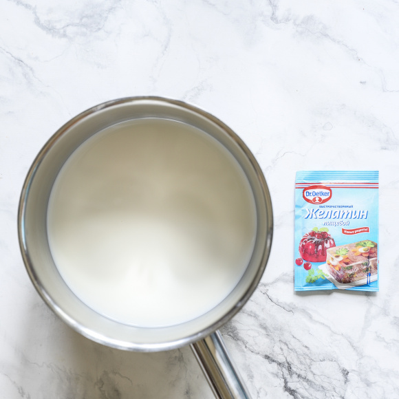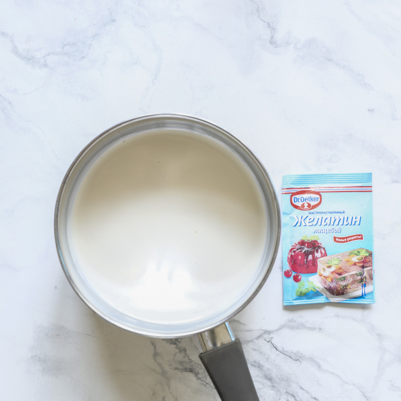 Прогреваем нежирные сливки до 60 градусов, важно не дать сливкам закипеть. Снимаем с огня. Желатин растворяем в горячих сливках, перемешиваем несколько раз. Процеживаем.