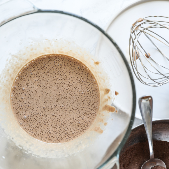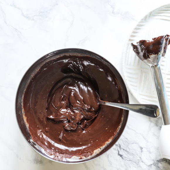 Прогретые сливки с желатином соединяем с растопленным шоколадом и пробиваем погружным блендером, пока не исчезнут все пузырьки.
