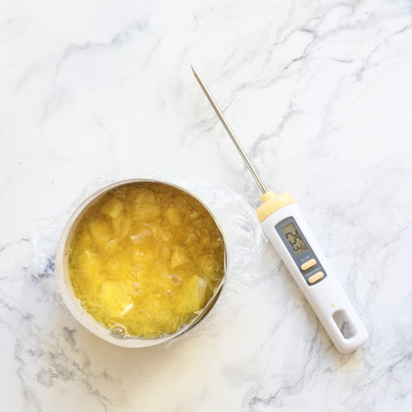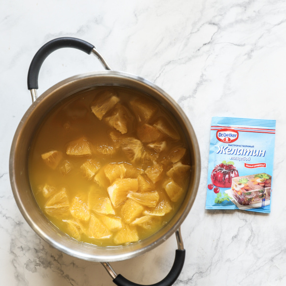 Крупный апельсин чистим, освобождаем от косточек и пленок, нарезаем небольшими кусочками. Переливаем в сотейник апельсиновый сок (натуральный или пакетированный), добавляем желатин, сахар и мякоть апельсина. На маленьком огне, помешивая, прогреваем компоте до 60 градусов. Обязательно пользуйтесь кухонным термометром.