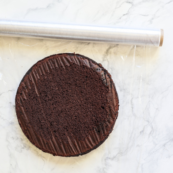 Подготовим форму для муссового торта. Обернем пищевой пленкой внутри и снаружи кольцо диаметром 20 см. Это нужно для того, чтобы в дальнейшем было легче достать готовый торт.
