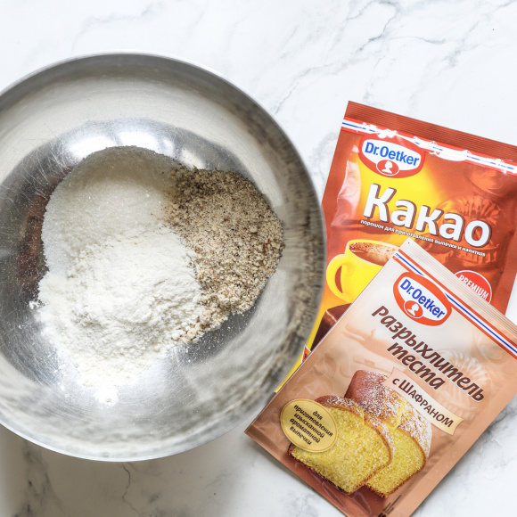 Просеиваем пшеничную муку, добавляем к ней разрыхлитель, миндальную муку и какао. Хорошо перемешиваем смесь, еще лучше сложить ее в чистый целлофановый пакет и немного потрясти. Аккуратно вмешиваем готовую сухую смесь в растопленный со сливками шоколад. На выходе получаем жидкое тесто, похожее на блинное.