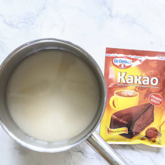 В сироп, не снимая с огня, добавляем просеянный какао-порошок, перемешиваем смесь венчиком несколько минут и выключаем огонь.